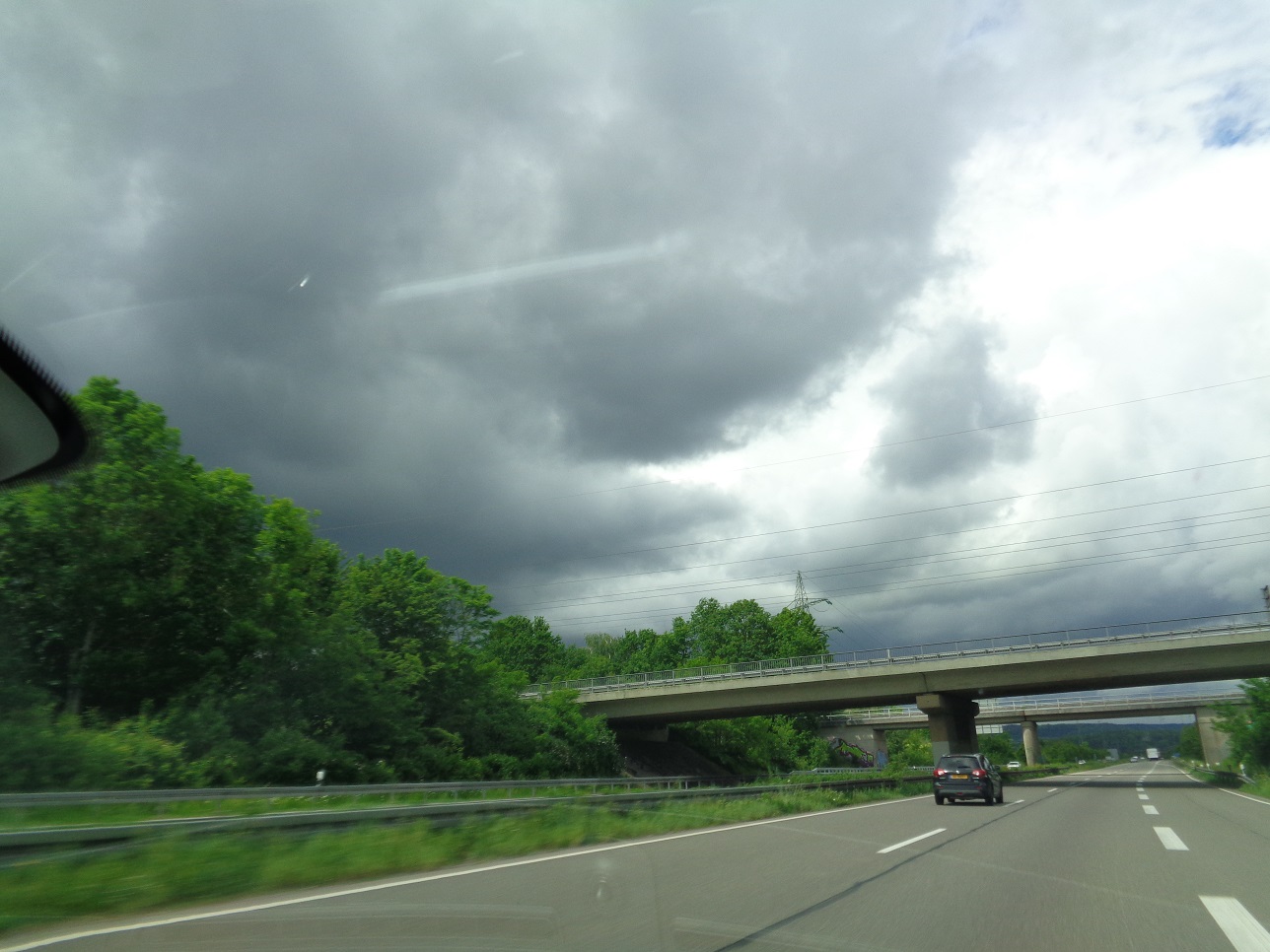 Das gute davon ist, die Tempi auf der AB gingen schlagartig von ca. 140 auf 60-70 (!) zurück. Die Sicht, wie man auf dem Foto erahnen kann, war gegen null - und das am hellichten Tag.Eines ist jedenfalls schon mal sicher: Conti kommen bei mir nicht mehr drauf! Bei Tempo 60 fingen die schon an zu schwimmen!