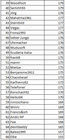Dann wäre ich ganz unten auf ca. Platz Nr. 70