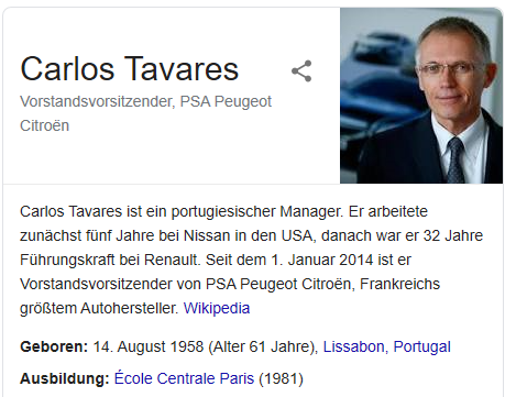 PARIS (dpa-AFX) - Der Konzernchef des französischen Autoherstellers PSA, Carlos Tavares, will sich laut Unternehmenskreisen am Donnerstag nicht öffentlich zu den Fusionsgesprächen mit Fiat Chrysler äußern. Der Zusammenschluss werde noch verhandelt und sei bisher nicht vereinbart, hieß es zur Begründung in den Kreisen. Der französische Opel-Mutterkonzern PSA und der italienisch-amerikanische Automobilhersteller Fiat Chrysler (FCA) hatten sich auf offizielle Fusionsgespräche verständigt. Tavares, der seine Fähigkeiten als harter Sanierer bei der PSA-Tochter Opel unter Beweis stellte, soll den neuen Konzern als Vorstandsvorsitzender führen./cb/DP/stk