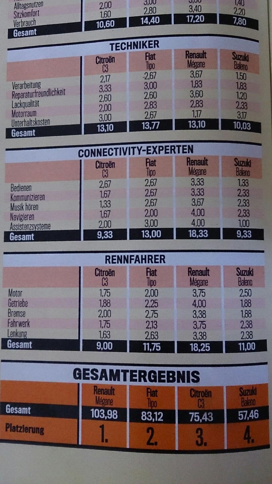 In der Klein- und Kompaktwagen Klasse hat unser Tipo den 2. Platz belegt, hinter dem Renault Megane, der mit 103,98 Punkten gewonnen hat. Der Tipo landete mit 83,12 Punkten auf Platz 2. Der dritte Platz ging an den Citroen C3 mit 75,43 Punkten.