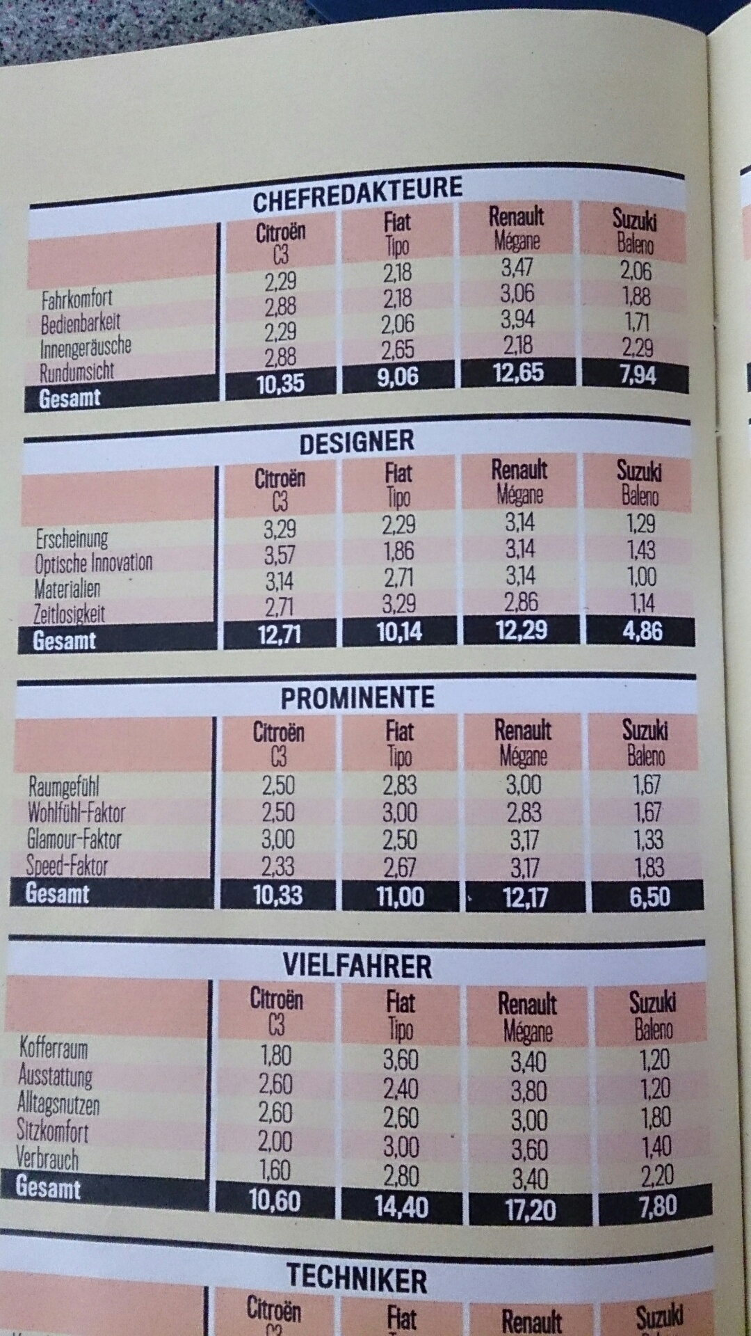 Die Chefredktion der Auto-Bild hat den Tipo "schlechter" bewertet, als die Gruppen Designer, Prominente, Vielfahrer, Techniker, C-Experten und die Rennfahrer.