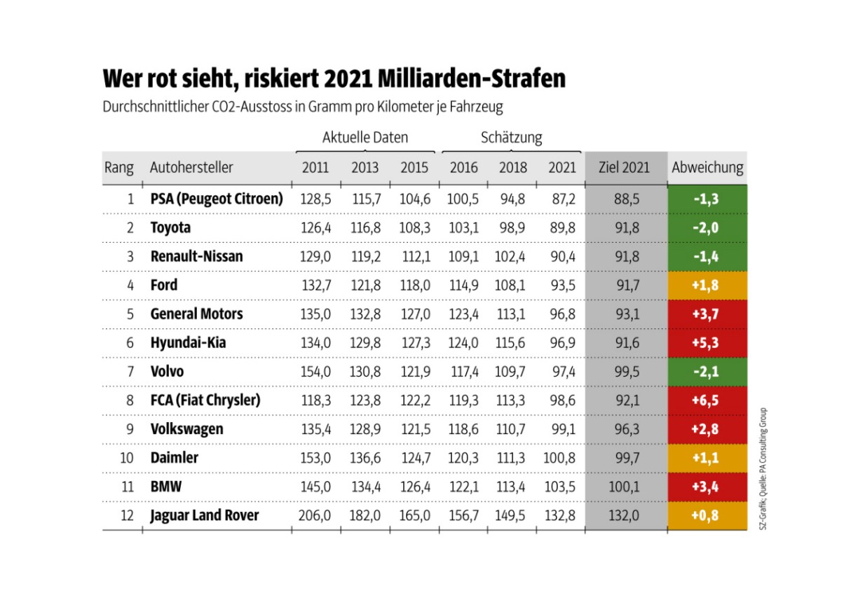Die Kosten der Zielverfehlung können hoch sein: Die EU plant mit 95 Euro für jedes Gramm CO₂ über dem herstellerspezifischen Ziel, multipliziert mit der Zahl verkaufter Fahrzeuge. Für BMW könnte sich dies auf rund 350 Millionen Euro belaufen, für Fiat Chrysler auf 600 Millionen Euro und für Volkswagen sogar auf bis zu einer Milliarde Euro.