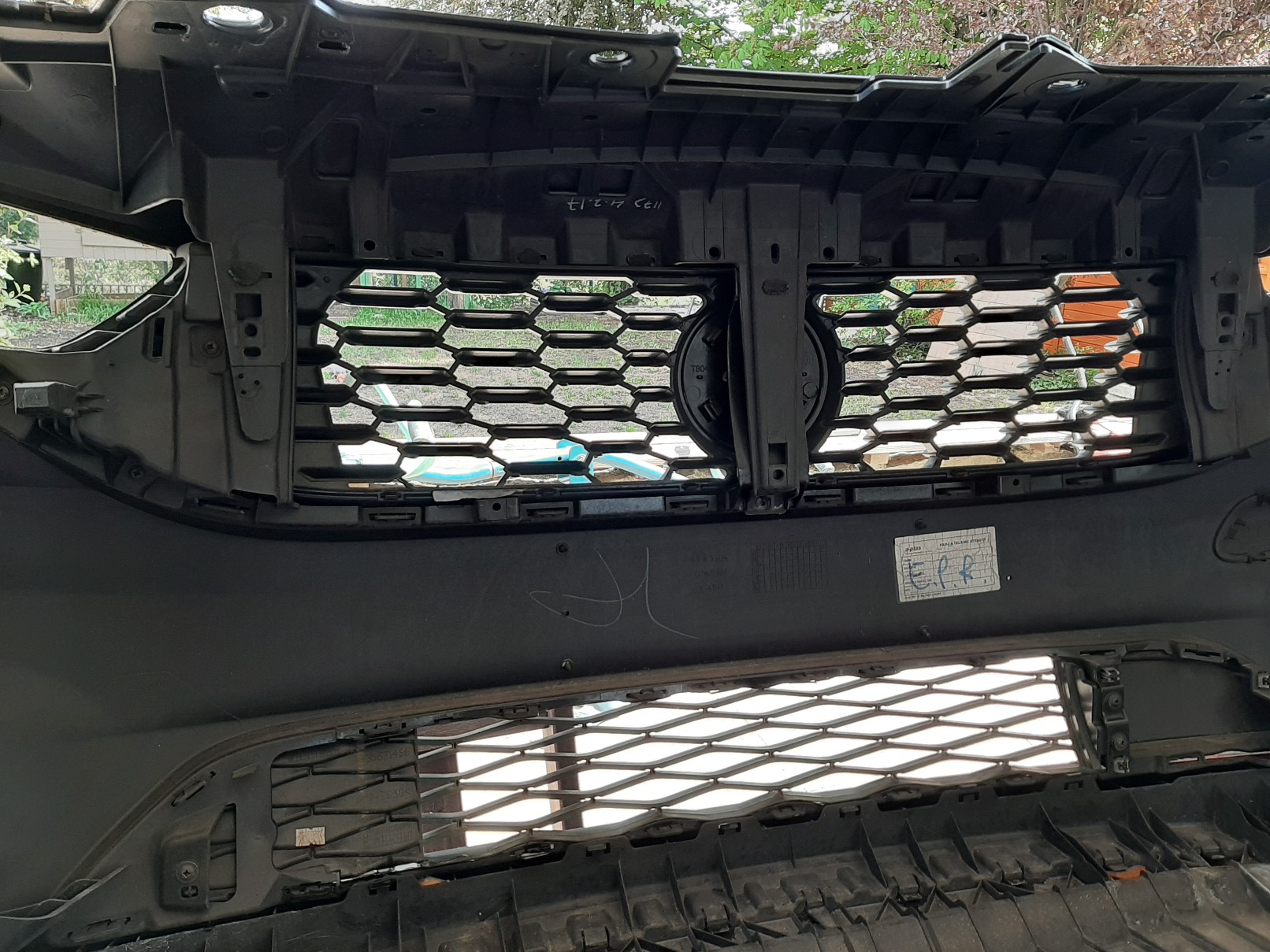 Das stimmt. Und selbst wenn man die Frontschürze abgebaut hat, ist es knifflig den Grill herauszubekommen, weil er geclipst ist und die Clipse größtenteils von einer verklebten Verstärkung auf der Rückseite der Frontschürze verdeckt werden. Diese Verstärkung hält hinter dem Grill den oberen und den unteren Teil der Frontschürze zusammen, sonst würde das obere Teil ohne Grill "in der Luft" hängen. -