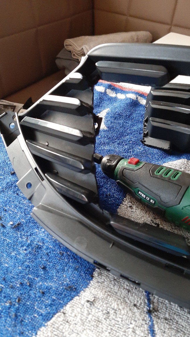 Das stimmt. Und selbst wenn man die Frontschürze abgebaut hat, ist es knifflig den Grill herauszubekommen, weil er geclipst ist und die Clipse größtenteils von einer verklebten Verstärkung auf der Rückseite der Frontschürze verdeckt werden. Diese Verstärkung hält hinter dem Grill den oberen und den unteren Teil der Frontschürze zusammen, sonst würde das obere Teil ohne Grill "in der Luft" hängen. -
