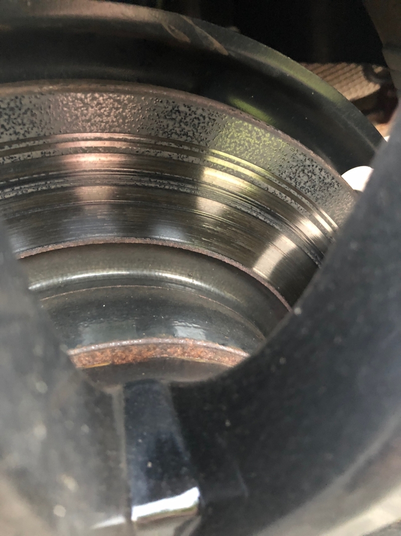 • Weil wir gerade bei den hintern Bremsen sind, darf nach 5000 km und 5 Monaten eine Scheibe so aussehen? Ich denke nicht, was sagt der Profischrauber dazu?