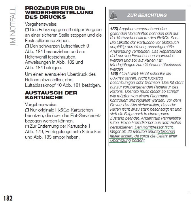 Meine Kartusche sollte bei letzten Inspektion (75.000 km, nach 4,5 Jahren) gewechselt werden. Fiatmeister meinte die wäre abgelaufen. Habe nein gesagt und benutze es weiter. Letztens noch dem Nachbarn und seinem Fiat500 den platten Reifen aufgepumpt.....