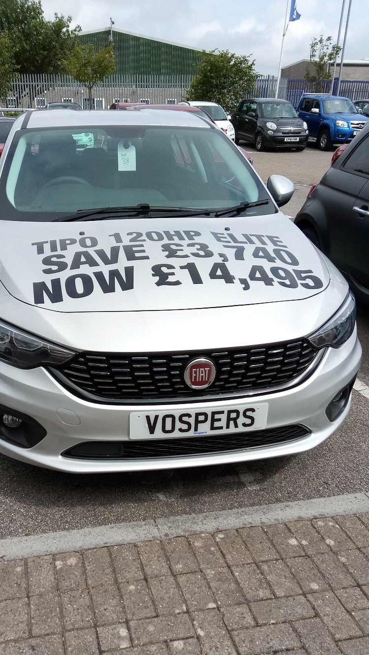 Nachdem ich gelesen habe, dass nur 10 Minuten entfernt von meinem aktuellen englischen Landsitz ein Fiathändler ist, bin ich vorhin Mal hin. Wie zu erwarten 500er ohne Ende, einige schicke Abarth und drei Tipo HBs, einer davon in der Sportversion mit 18 Zöllern und fettem Dachspoiler.