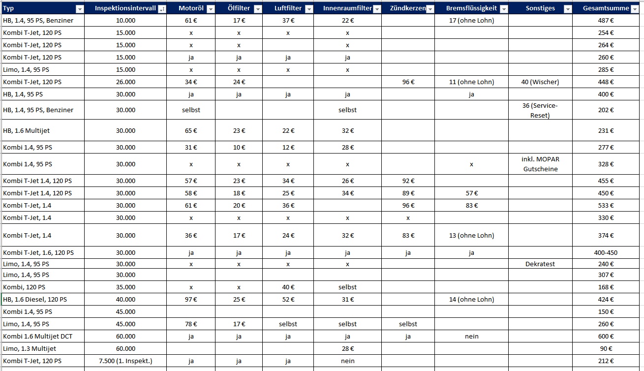 durchgeführt werden muß, kann ich das Öl mitbringen, Inspektion incl. Luft- und Pollenfilter 99€. Beim Vertragshändler, Öl 18(!)€ pro Liter, alles zusammen 250€. Habt ihr Erfahrungswerte, wie FIAT reagiert, wenn man das Auto, nach Herstellervorgaben, bei einer freien Werkstatt warten lässt
