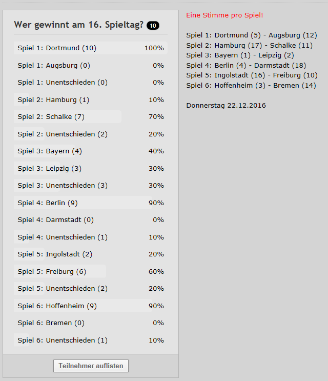 Unsere Besten beim 16. Spieltag waren Tiffy123 und TipTop mit 4 von 6 Punkten.