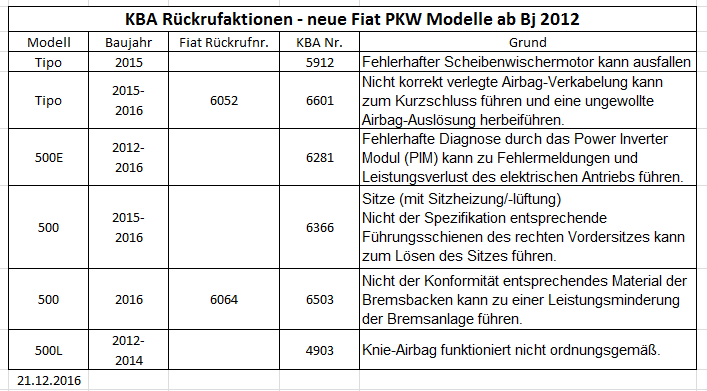 KBA Rückrufliste 2016 -neue Fiat PKW Modelle ab Bj 2012