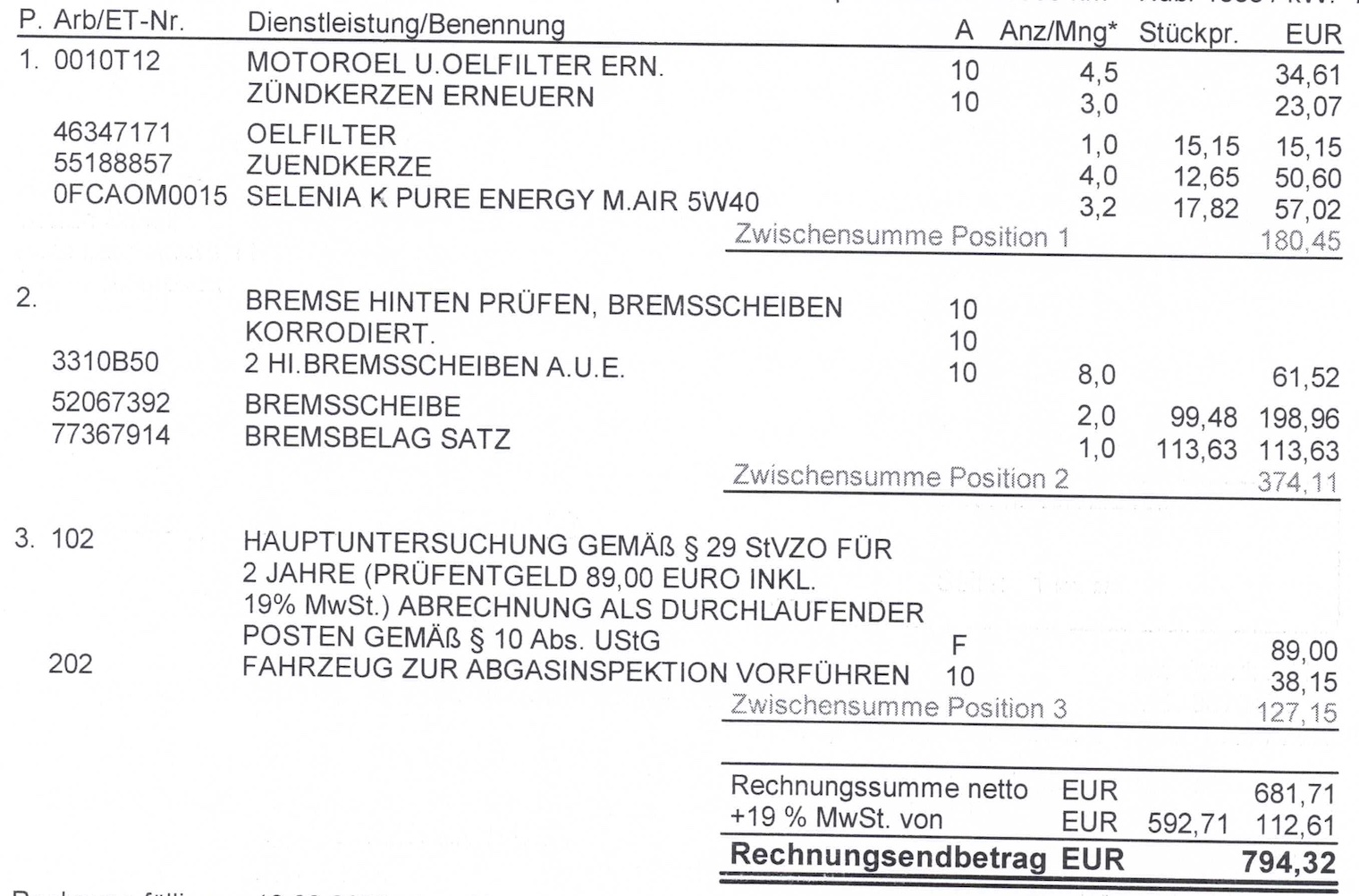 Ahja und dann haut er noch Raus.: Service mit Tüv und Bremsen macht dann 980 Euro.Ach und das nun alle 2 Jahre.