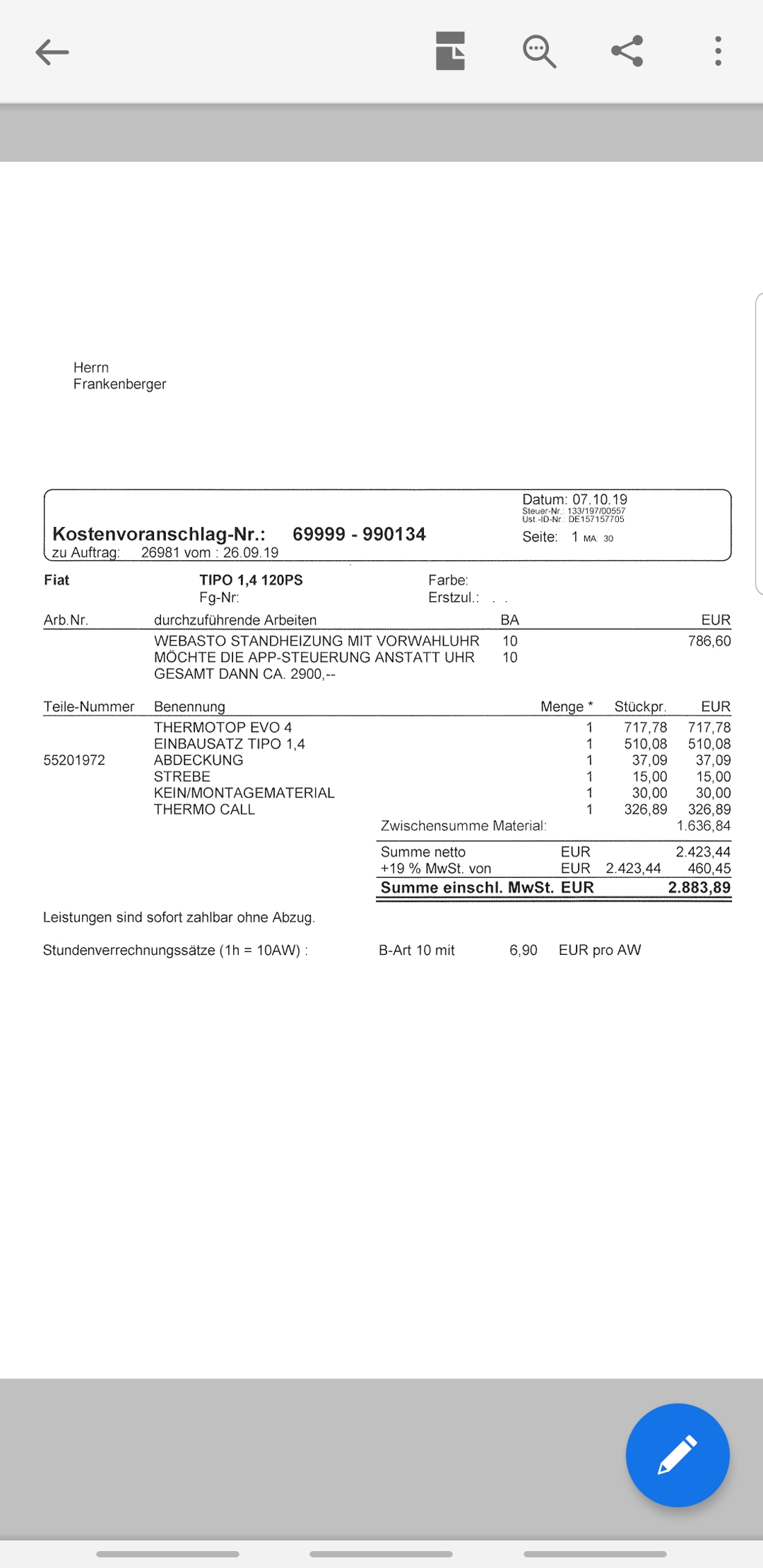 Wenn sich jmd hier auskennt, seht euch bitte das Angebot des FiatHändlers an. Ich fand den Preis ohne Arbeitsstunden heftig oder findet ihr das normal?
