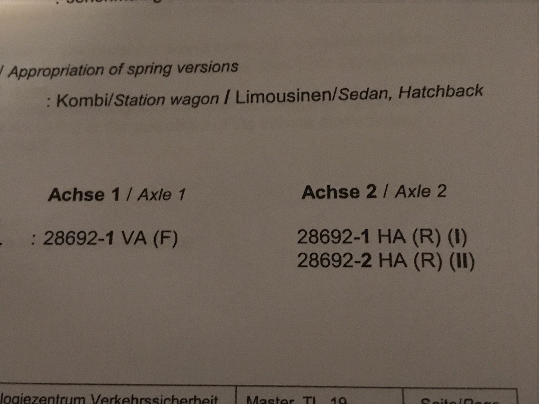 Die Feder für die VA ist bei allen gleich, also 40mm. Lediglich für die Hinterachse gibt es zwei verschiedene Versionen, wegen der unterschiedlichen Achslast des Kombis im Vergleich zu Limo und Hatchback. -