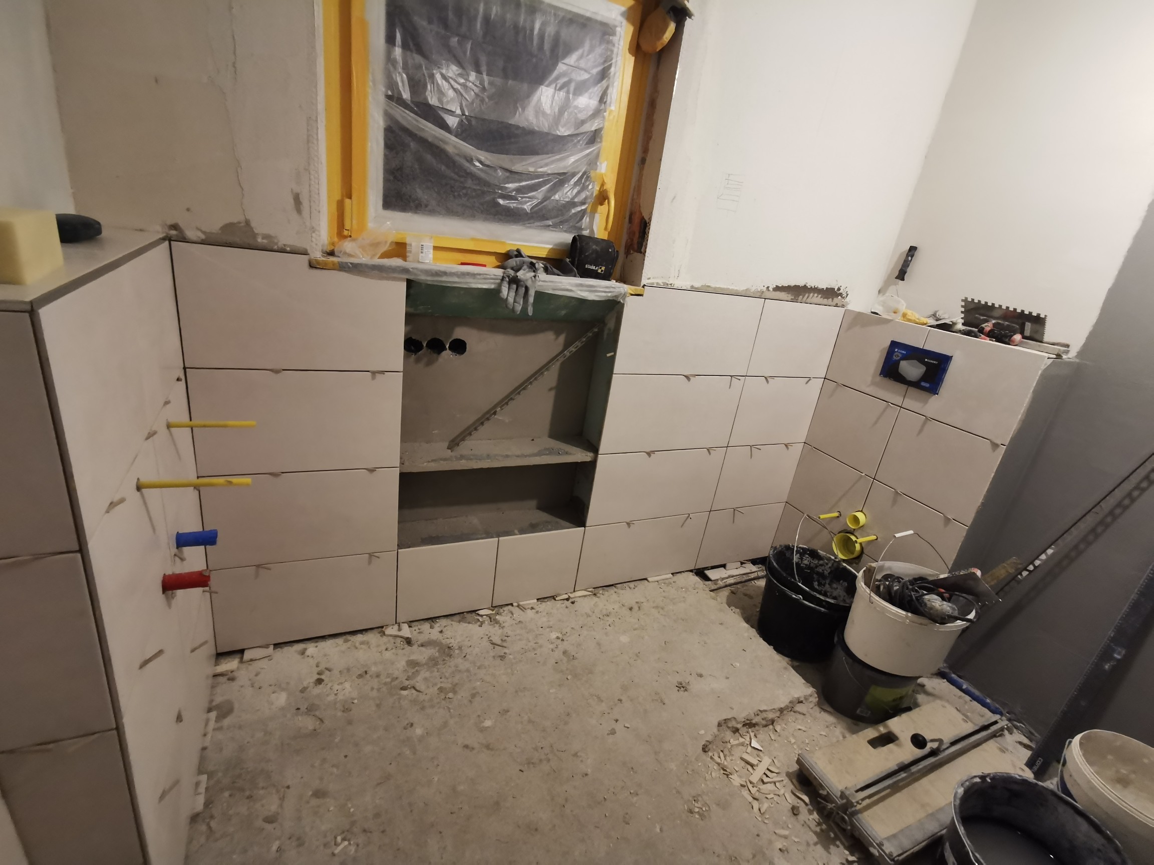 Nachdem die Küche am Mittwoch eingebaut worden ist, ist heute das Bad teilweise gefliest worden. Ich hoffe daß ich am Mittwoch wieder zu Hause douchen kann und nicht mehr in der Firma