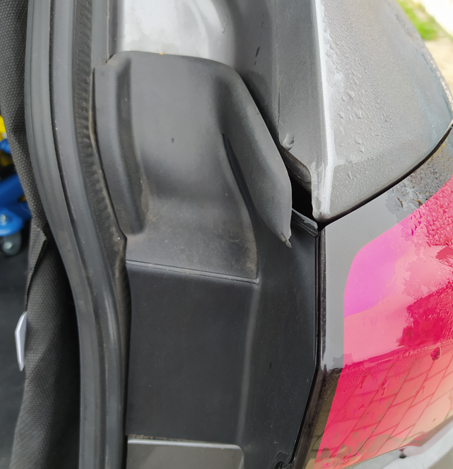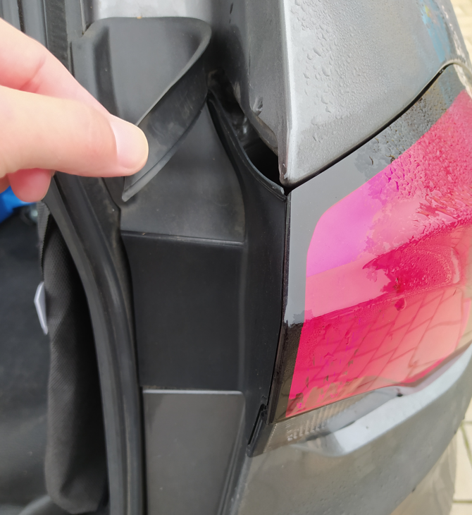 Bei geöffnetem Kofferraum kommt links und rechts eine Gummiabdeckung zum Vorschein, die die Rückleuchte offensichtlich vor Wassereintritt schützen soll.