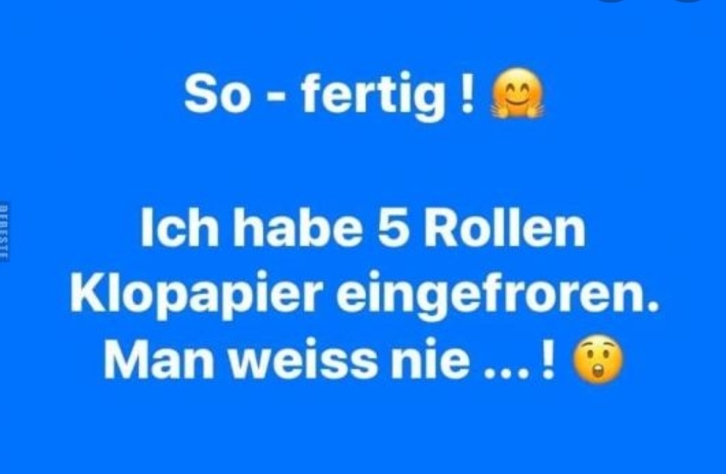 Na, dann reißt Euch doch auch mal alle zusammen. Warum schei.... ihr denn auch alle wie die Verrückten. Früher wurde die Bildzeitung in kleine Blätter zerschnitten, gelocht und mit Schnur versehen aufm Klo aufgehängt. Die Verwendung erfolgte dann je nach Bedarf blattweise.