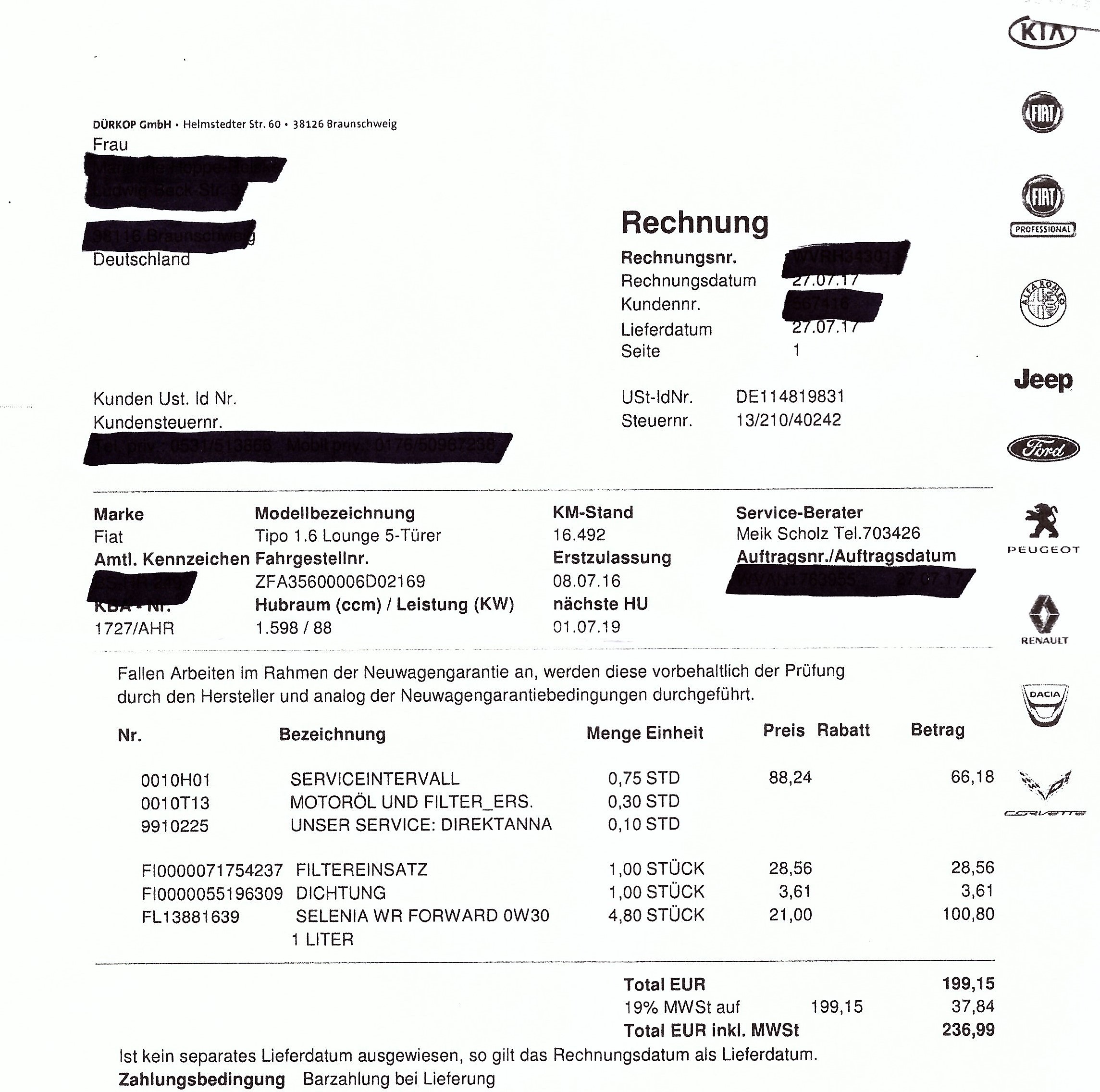 Im Anhang noch die Rechnung meines Verwandten für die erste Inspektion.