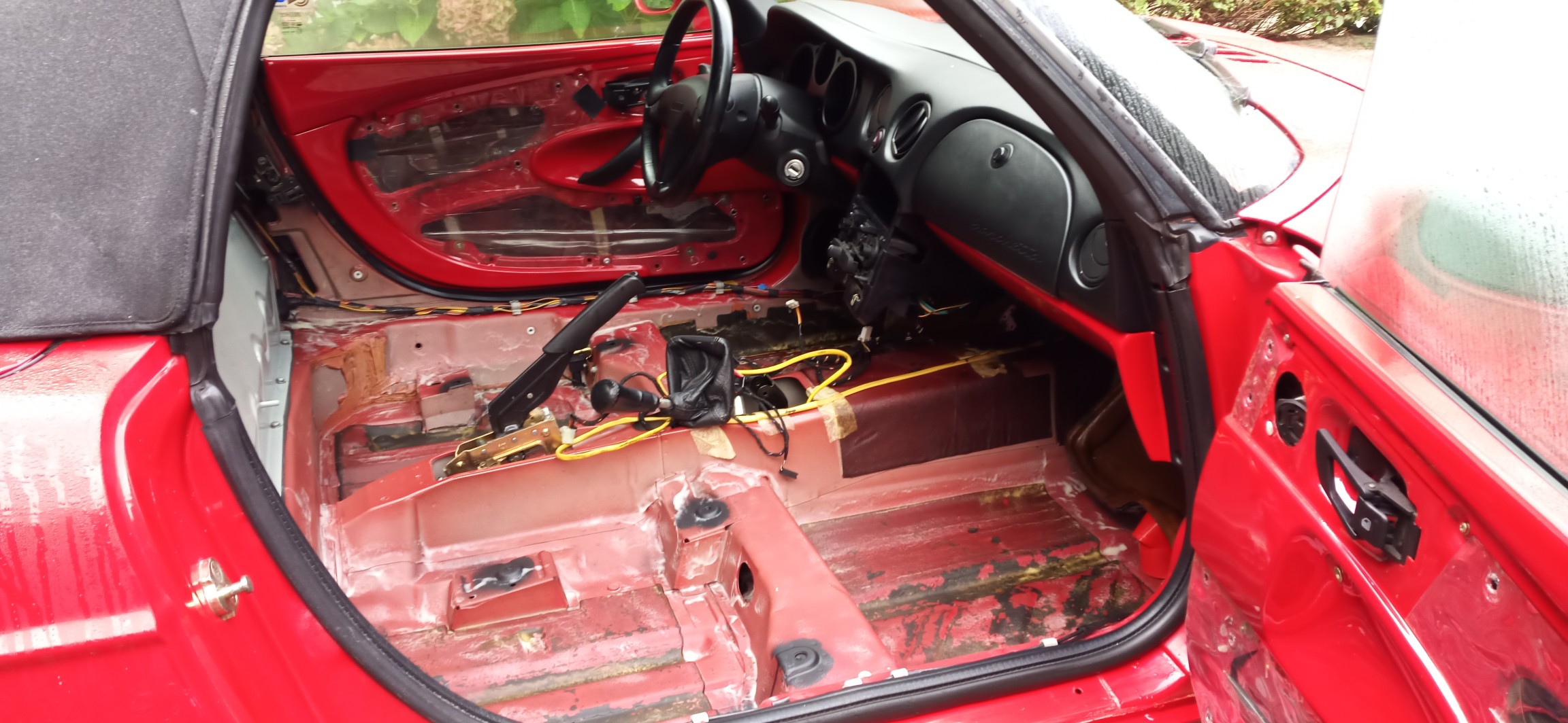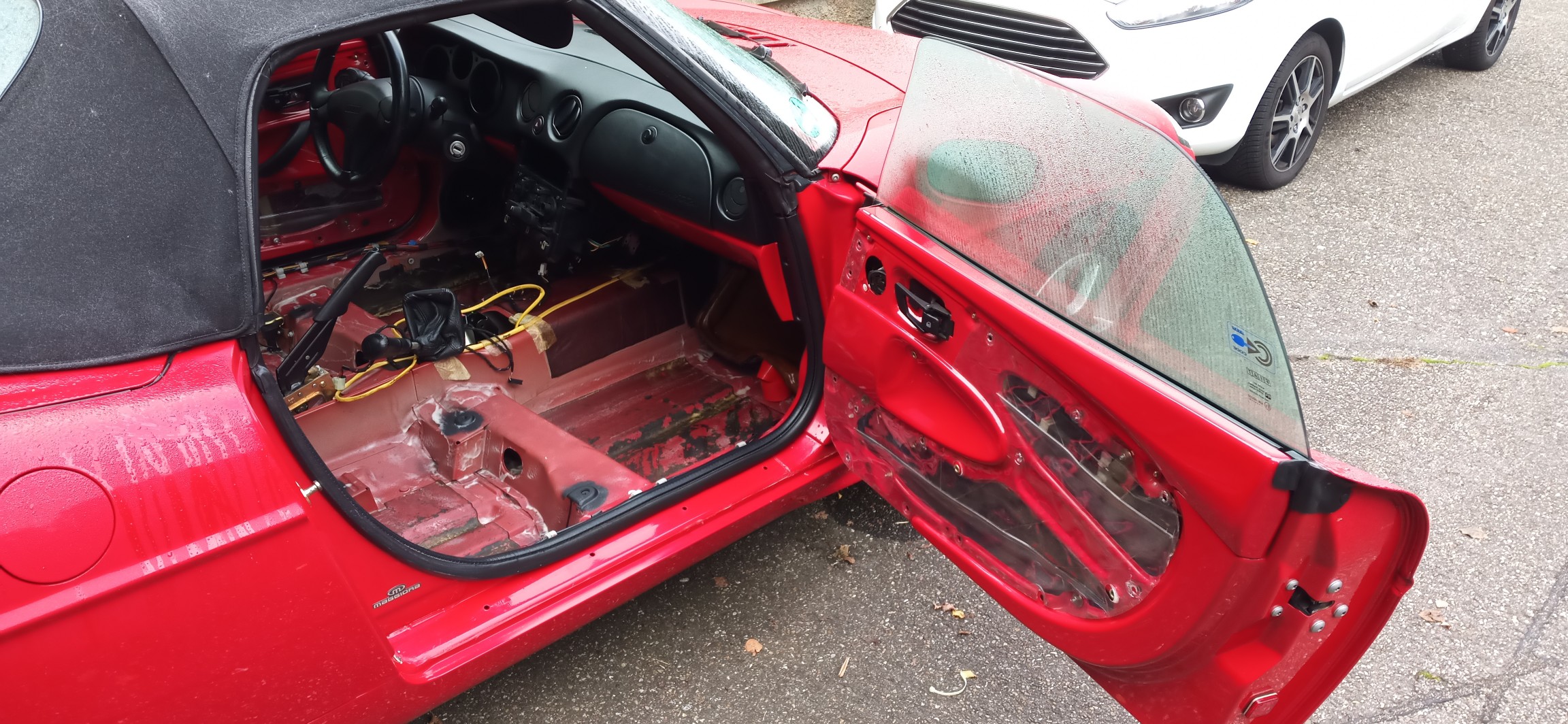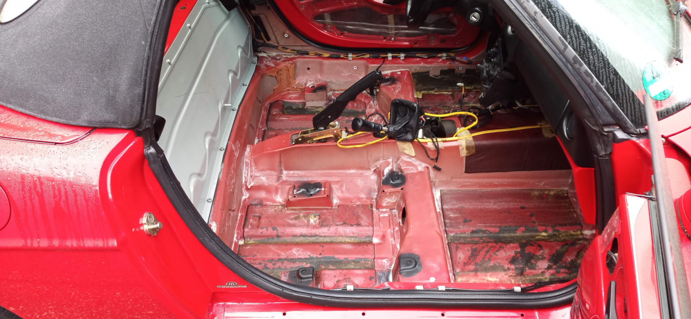 Kürzlich musste ich feststellen das die "Alte Dame" undicht geworden ist. Das bedeutet das Regenwasser über Umwege zwischen Bodenblech und Gummiwanne (Barchettas haben keinen Teppich) läuft. Das ganze speichert sich dann wunderbar in der mehrere Zentimeter dicken Dämmung.