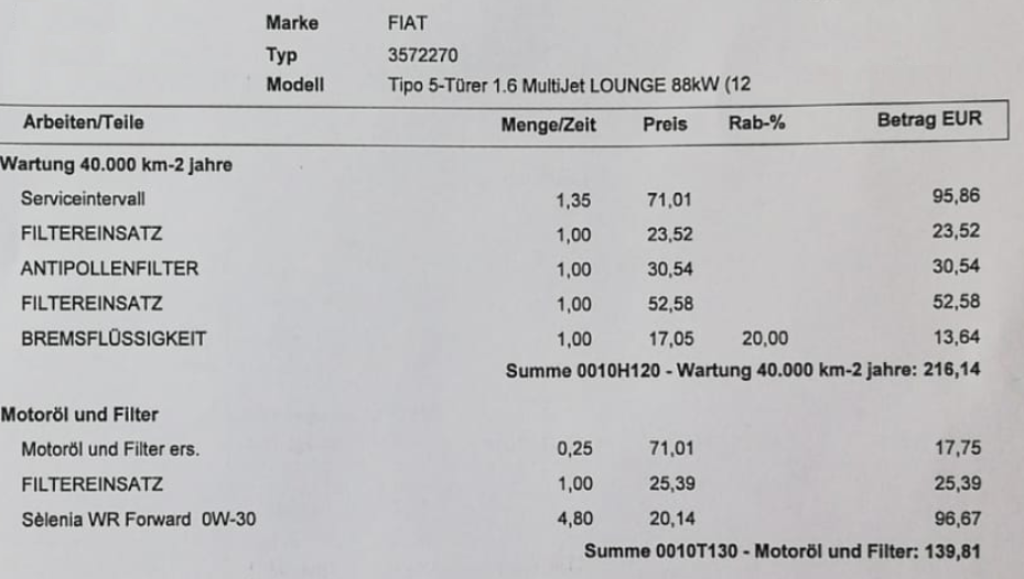 mein 1.6 Diesel war bei der 40k Inspektion, und ich bin beinahe umgefallen, als ich die Rechnung bekommen habe. Die Preise sind zuzüglich Steuer - ich habe für alles 423,57 EUR bezahlt. Ich war bei einem autorisierten Fiat-Vertragspartner nahe Krefeld.