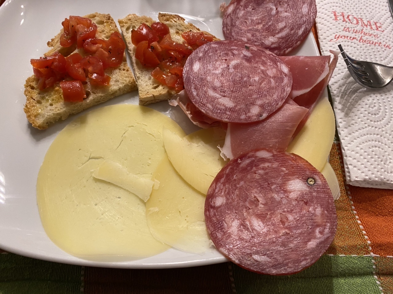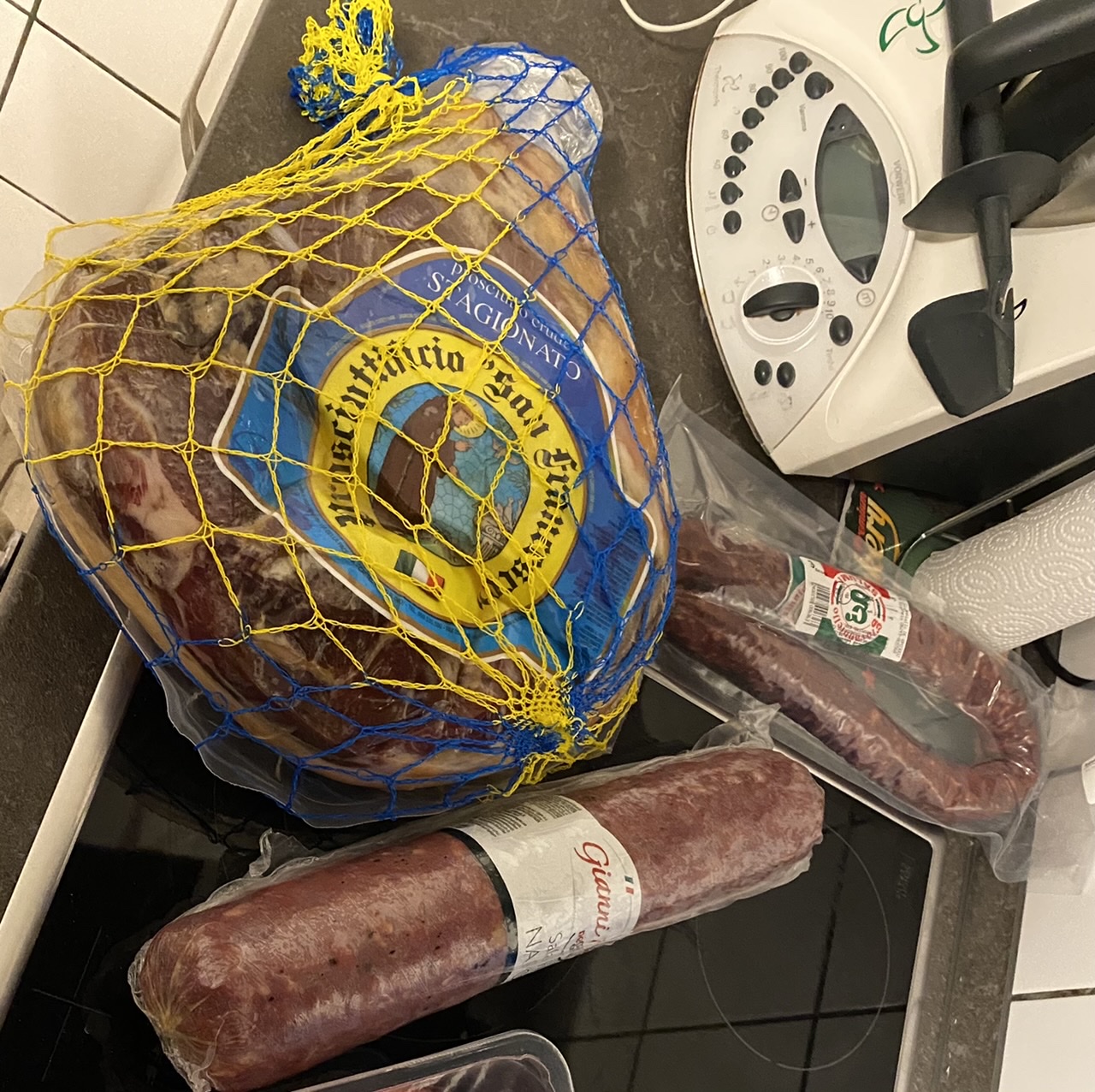 Heute Mittag gabst selbst gemachte tagliatelle mit Bolognese und jetzt Antipasti und danach Fleisch und Nachtisch typisch Italiener panettone
